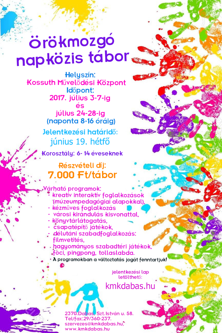 15máj.2017 Örökmozgó nyári tábor I-II. Jelentkezési lap letölthető itt..... Örökmozgó nyári napközis tábor mellékletei: Jelentkezési lap Egészségügyi nyilatkozat